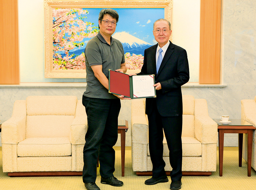 | 藝術家林俊良教授(左)致贈他的作品給創價典藏,林 理事長代表接受。 |