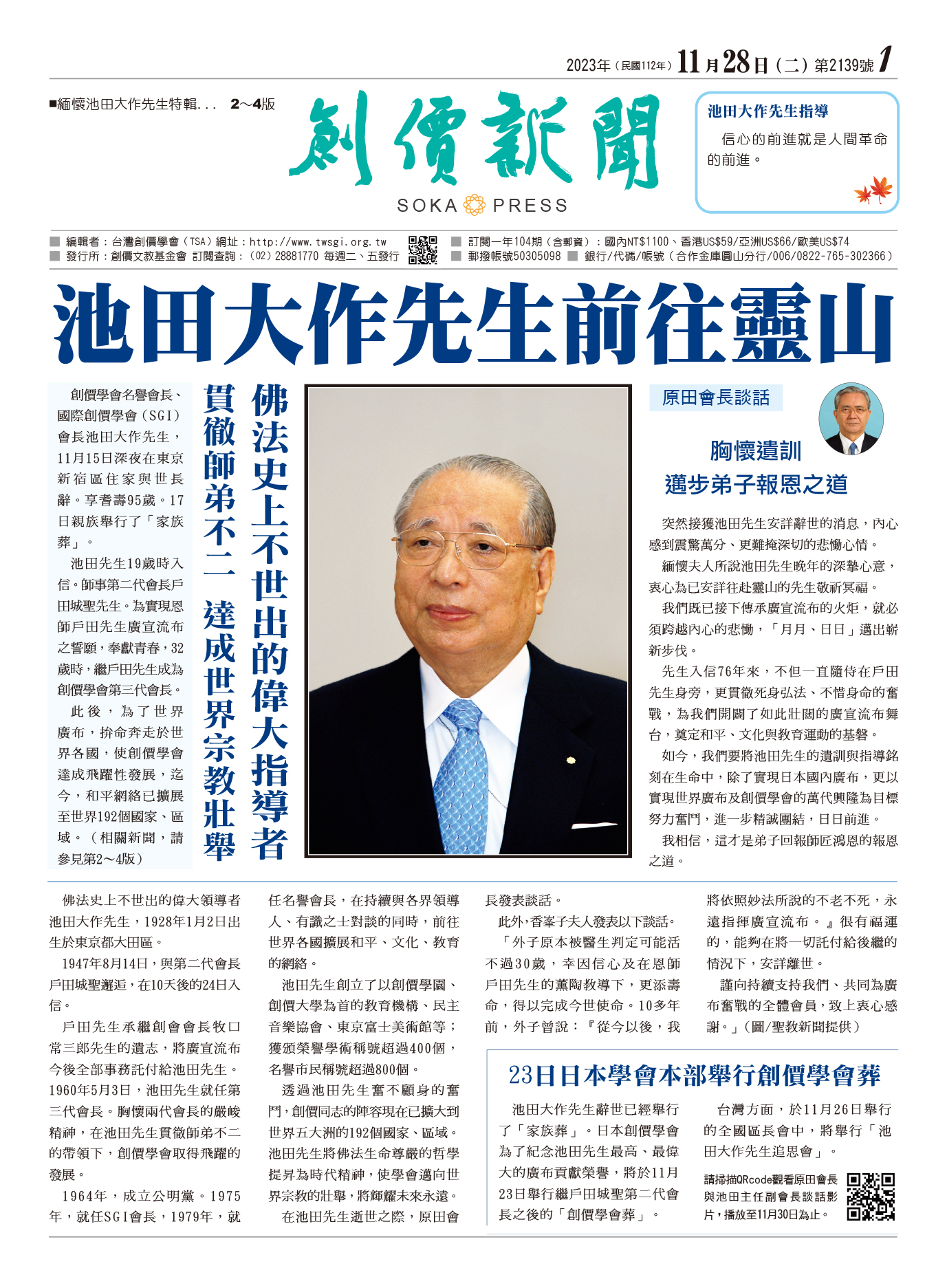 台灣創價學會 版權所有 轉載必究 © 2014 Taiwan Soka Association All Rights Reserved. 111台北市士林區至善路二段250號 TEL:(02)2888-1777