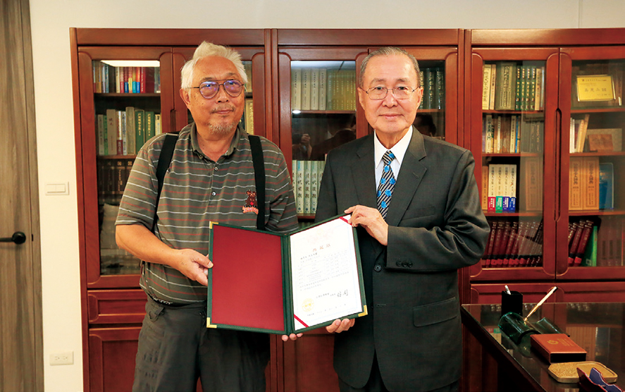 | 林理事長頒贈典藏狀給楊恩生教授(左) |
