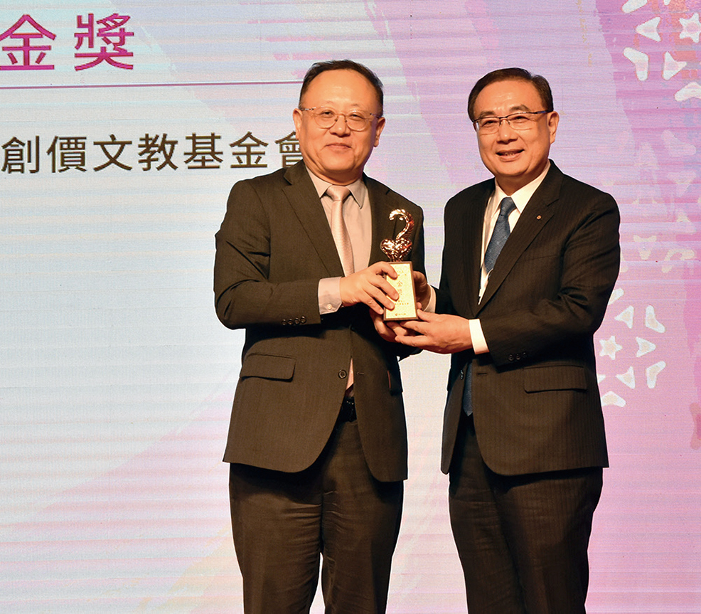 | 文化部長史哲(左)頒發文馨獎給創價,副理事長洪玉柱代表接受。 |