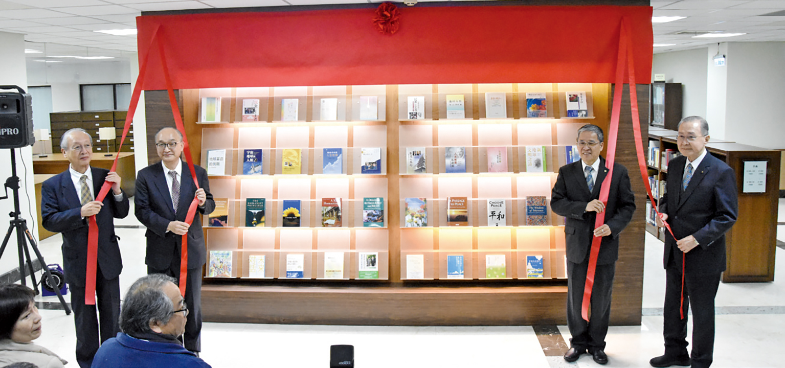 池田大作專區揭幕儀式,左起神立孝一副校長、內山勝局次長、唐彥博校長、林釗理事長。