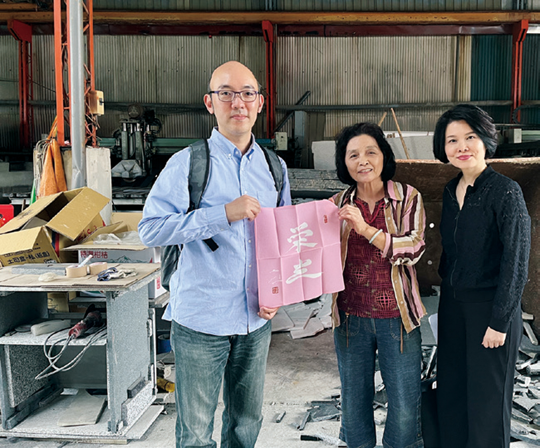 壯年部鍾一丞的大理石工廠因強震而受損,兩位共同執行長關心、鼓勵其母親江素貞(中)。