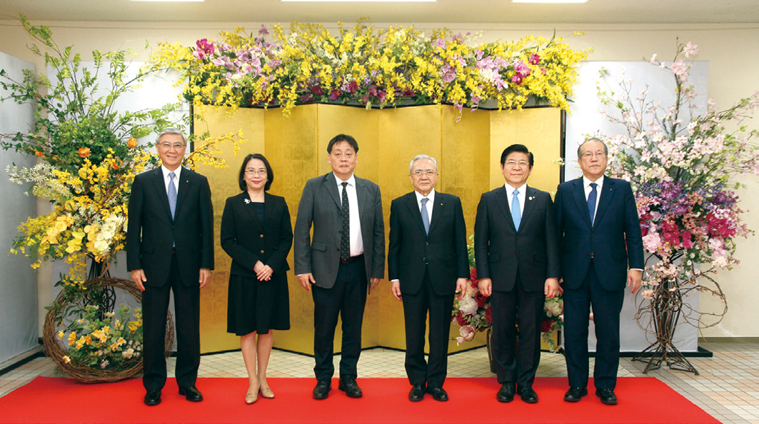 | 王子奇校長(左3)與創大最高顧問原田稔(左4)等人合影。 |