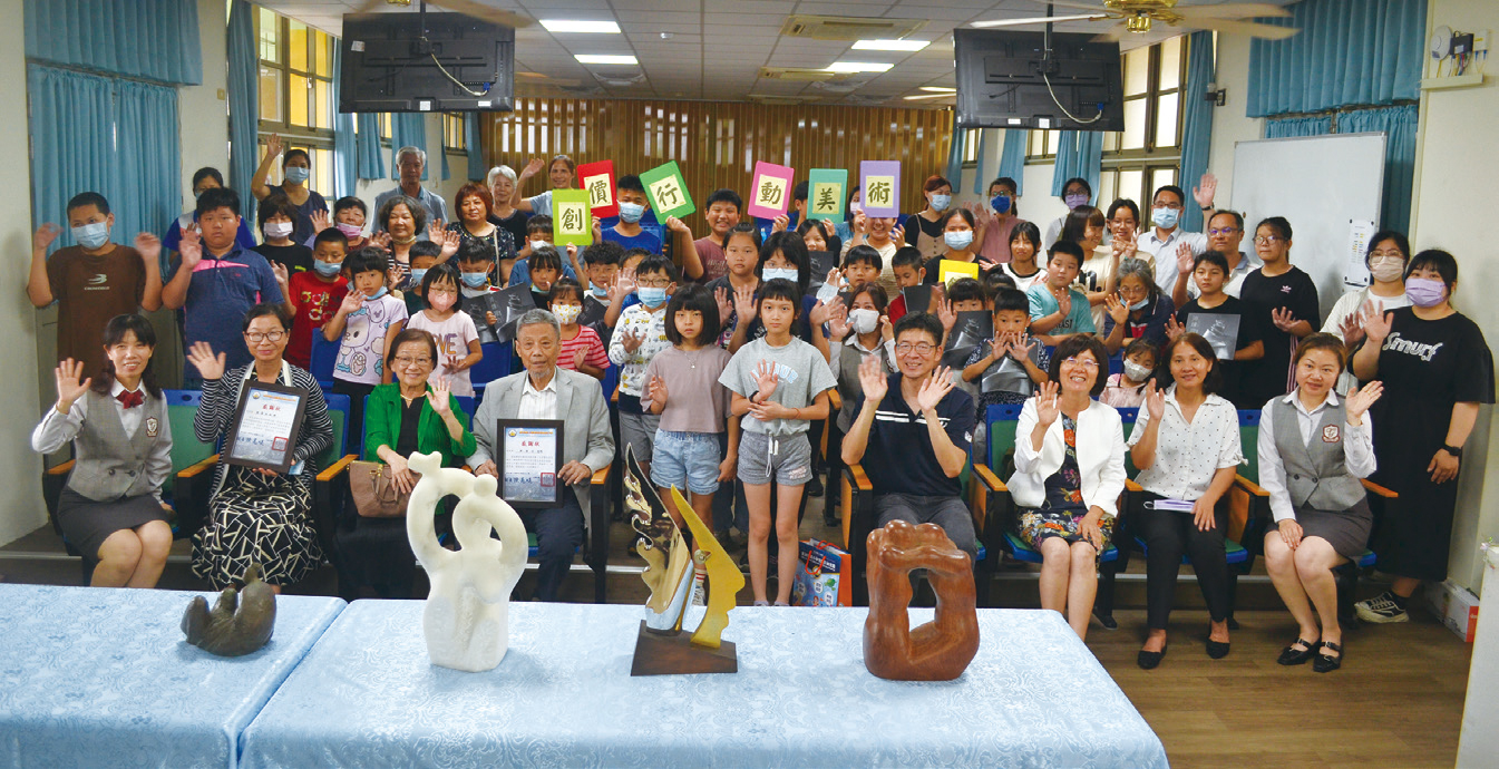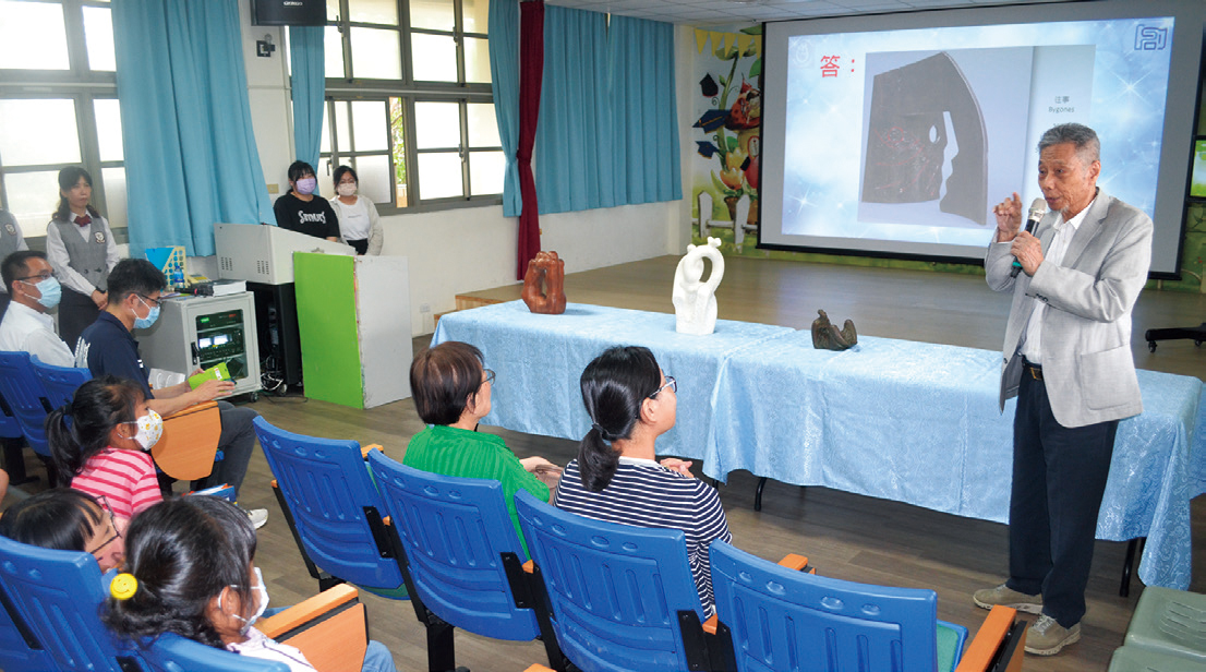 此次,郭老師特別帶來四件不同材質的雕塑作品,深入淺出地說明每件作品的意義,更鼓勵學生觀看他的作品時,可以用手去觸摸,以感受不同材質的觸感。上台分享的學生對郭清治伉儷說:「謝謝郭爺爺、郭奶奶,帶來這麼棒的作品,讓我們學習好多。」