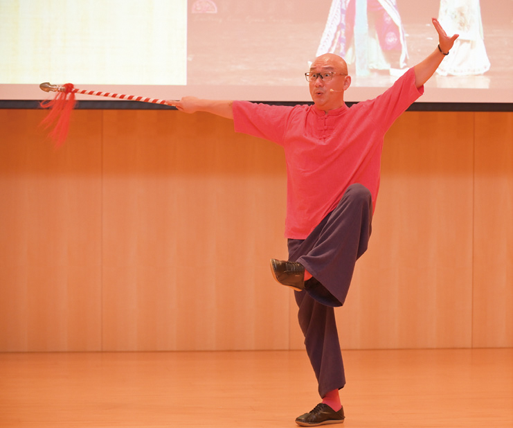 崑曲演員在劇中扮演的角色類型分為「生旦淨末丑」,其下又可細分「家門」。為了讓觀眾體會小生不同家門演出方式,他現場示範了《牡丹亭》的柳夢梅(巾生)、《繡襦記》的鄭元和(落魄的鞋皮生)、《連環記》的呂布(雉尾生)及《長生殿》的唐明皇(大官生),他一邊演唱、搭配手持蓮花棒、耍弄雙頭槍等,一邊又分段講說如何藉由演唱、身段的「移步換景」,其一氣呵成且充滿藝術張力的精彩演出、無窮的舞台魅力,贏得全場觀眾久久不歇的掌聲。