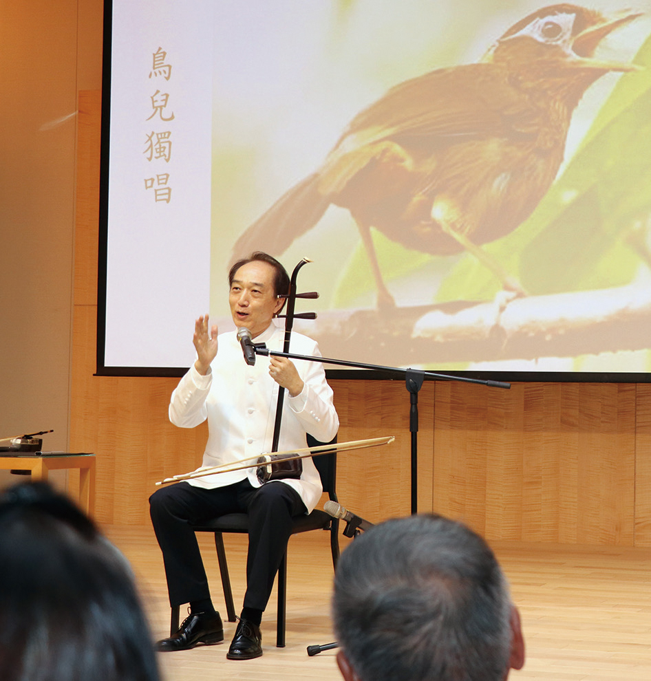 馮教授為大家介紹了二胡的歷史背景、代表人物等。他說,二胡樂音能夠模仿出動物等的聲音語調,這就是能夠流傳民間主要原因。他現場演奏〈好一朵茉莉花〉、〈二泉映月〉、〈台灣民謠組曲3〉、〈茉莉花香〉及〈八駿馬〉等膾炙人口的樂曲,其中,演奏〈八駿馬〉時,二胡旋律將模仿馬的嘶鳴聲表現得淋漓盡致,讓人彷如有置身在蒙古大草原上萬馬奔騰的感覺、〈空山鳥語〉像是在爬山路途中聽見歡快的鳥叫聲般生動的畫面。最後,在〈望春風〉、〈牽阮的手〉的琴音中,結束這場豐富、令人回味無窮的音樂饗宴!
